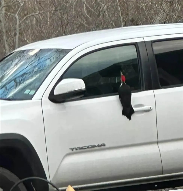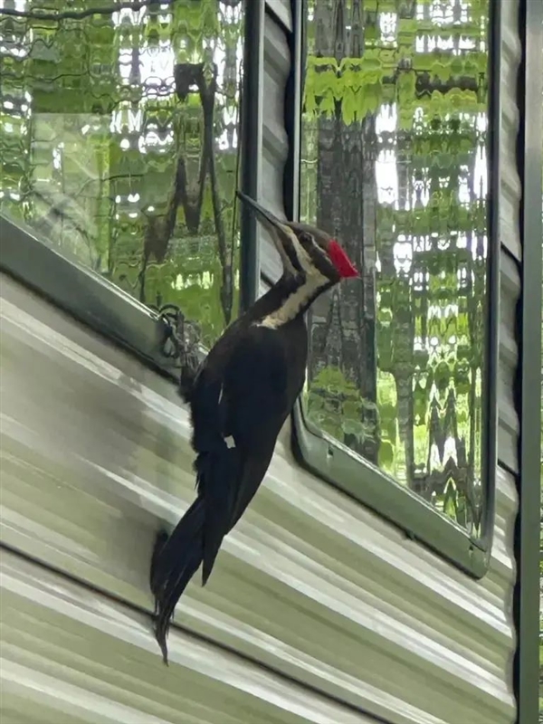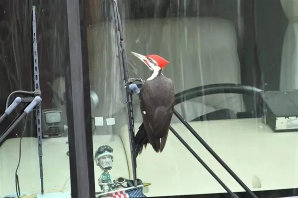 在一次偶然的機會,珍妮爾看到一只北美黑啄木鳥突然造訪自家院子,并落在房車的雨刷上,然后左看看右看看,一直盯著車窗上的倒影,最后居然還發起了攻擊:用翅膀撲棱,還會用嘴巴狠狠地啄玻璃。